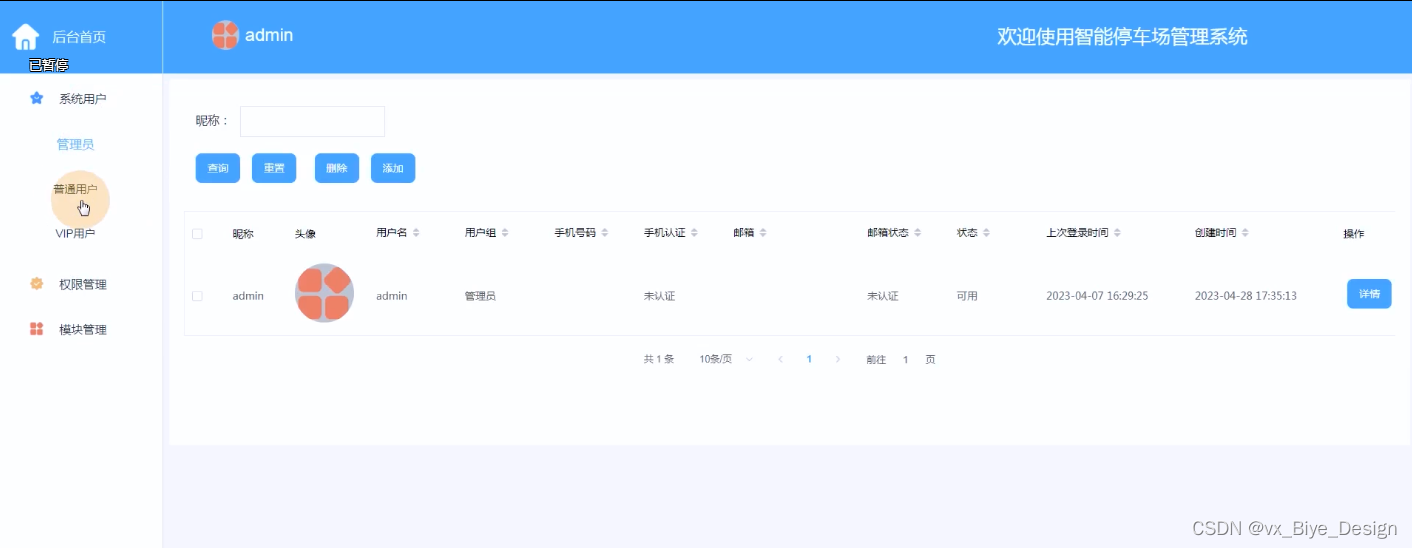 (1)系统用户:管理员可以对系统中所有的用户角色进行管控,包含了管理员、VIP用户以及系统用户这三种角色,如果需要添加新的用户,点击页面中的“添加”按钮根据提示输入上用户信息,点击“提交”以后在对应的用户界面就可以查看到了,可以点击用户后面的“删除”按钮直接删除某一用户。