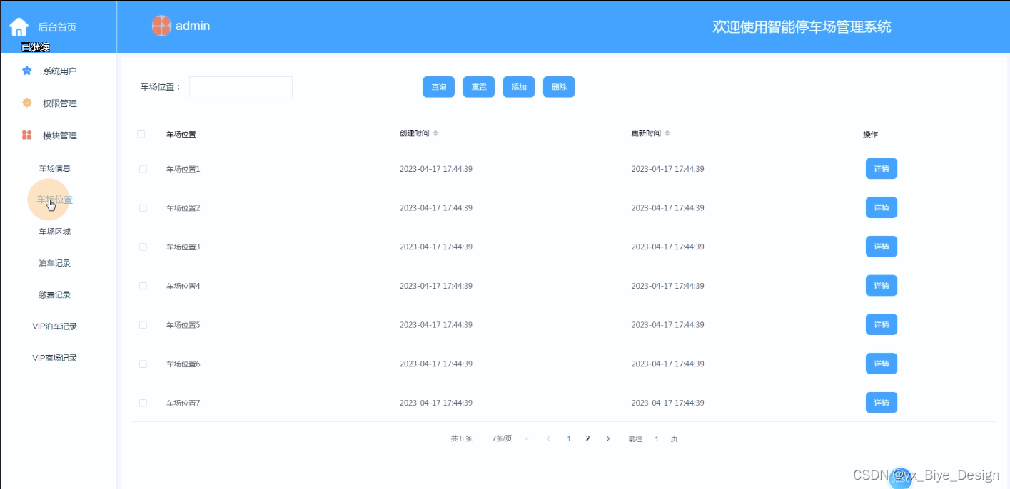 (3)车场位置:管理员点击“车场位置”会显示出所有的车场位置信息,支持通过车场位置对车场位置信息进行查询,如果想要添加新的车场位置信息,点击“添加”按钮,输入相关信息,点击“提交”按钮就可以添加了,同时可以选择某一条车场位置信息,点击“删除”进行删除。