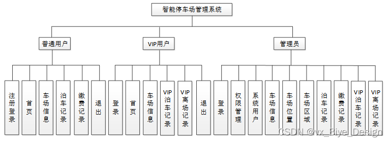 智能停车场管理系统我划分为了普通用户管理模块,VIP用户管理模块和管理员模块这三大部分。
