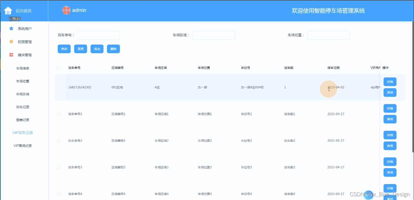点击“VIP离场记录”这个按钮可以查看到自己提交的所有的VIP离场记录,支持通过泊车单号或者区域编号或者车场位置进行查询VIP离场记录,如果想要添加新的VIP离场记录,点击“添加”按钮然后根据提示输入VIP离场记录,点击“提交”后,在VIP离场记录界面就会显示新增的VIP离场记录,可以点击某一留言查看VIP离场记录的详情,也可以直接点击“删除”进行删除VIP离场记录。界面如下图4.7所示。