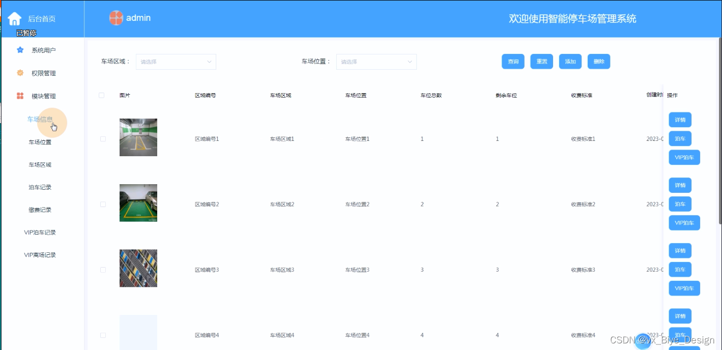 (2)车场信息:管理员点击“车场信息”会显示出所有的车场信息,支持输入图片或者区域编号对车场信息进行查询,如果想要添加新的车场信息,点击“添加”按钮,输入相关信息,点击“提交”按钮就可以添加了,同时可以选择某一条车场信息,点击“删除”进行删除,也可以点击后面的“泊车”、“VIP泊车”按钮对车场信息的泊车/VIP泊车信息进行更新维护;