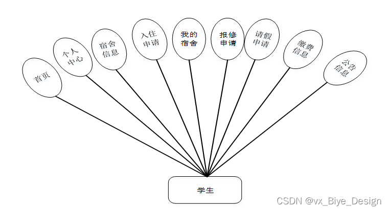 (2)学生:首页、个人资料、宿舍信息、入住申请、我的宿舍、报修申请、请假申请、缴费信息、公告信息等功能。学生用例如图3-2所示。
