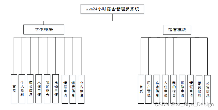 本24小时宿舍管理员系统主要包括四大功能模块,即管理员、宿管、学生模块。