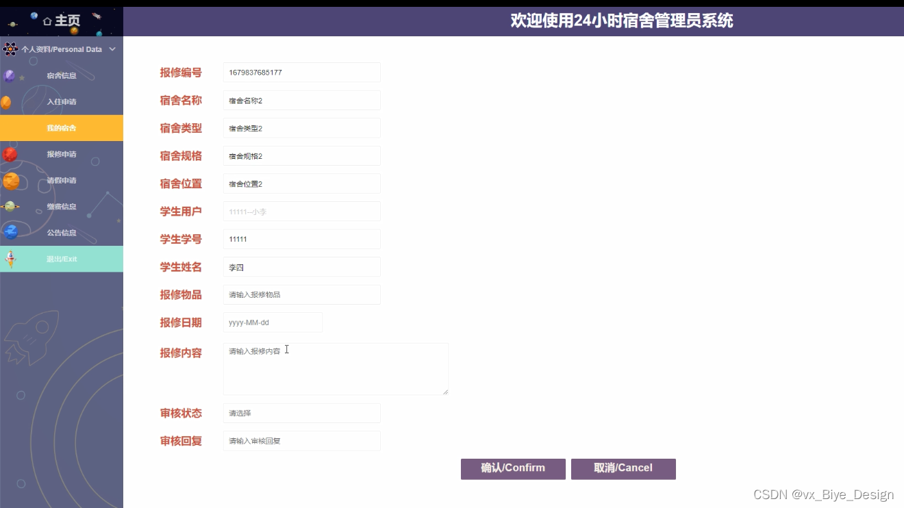 报修申请信息,在报修申请页面中可以填写报修编号、宿舍名称、宿舍类型、宿舍规格、宿舍位置、学生用户、学生学号、学生姓名、报修物品、报修日期、报修内容等操作。如图5-11所示。
