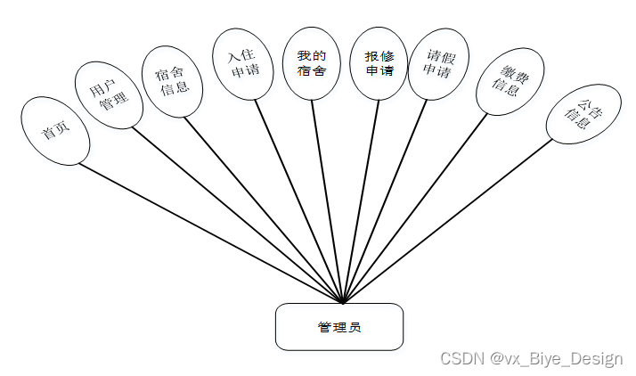 (1)管理员模块:系统中的核心用户是系统管理员,管理员登录后,通过管理员菜单来管理系统。主要功能有:首页、个人资料、用户管理(管理员、学生)宿舍信息、入住申请、我的宿舍、报修申请、请假申请、缴费信息、公告信息等功能。管理员用例图如图3-1所示。