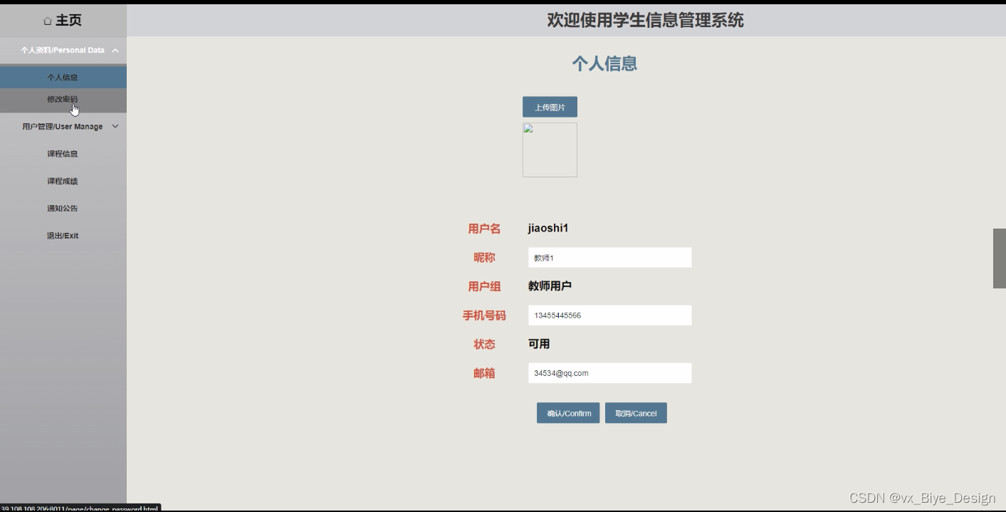 教师首页页面可以查看首页、个人资料、学生管理、课程信息、课程成绩、通知公告等信息,进行操作,如图5-11所示。