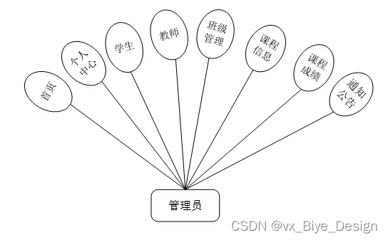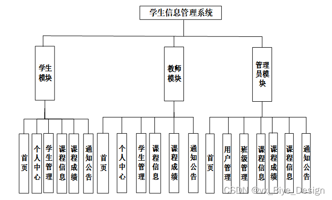 系统设计的目的是分析系统包括的所有功能结构,为开发人员设计开发和实现系统做好准备工作。经过前期的需求调查、分析和整理之后,确定的总体需求主要包括多个模块,分别是:首页、个人资料、用户管理(管理员、教师用户、学生用户)班级管理、课程信息、课程成绩、通知公告。系统整体角色分为三个部分,一是学生、二是教师、最后是管理员。权限分布也是很明显,学生、教师是在除去浏览信息之外还具有查询和管理自己账户信息权限;管理员是最高权限拥有者。