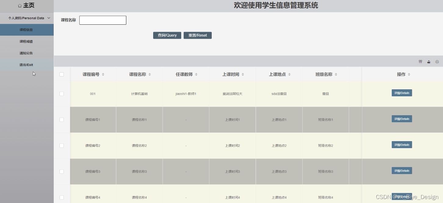 本系统是一款资源型管理软件,适用于普通高等教育学生的管理工作,具有丰富,完整,规范的内容和比较完善的功能.是一个适用于高等院校或各类专科学校学生工作管理部门的计算机辅助管理系统,它具备高校学生工作部门的学生管理的日常事务性工作及各类数据的自动化处理功能.从首页、个人资料、用户管理(管理员、教师用户、学生用户)班级管理、课程信息、课程成绩、通知公告全部业务功能.该系统能够自动地收集,存储,加工处理,查询检索和统计制表,方便有效地提高学生工作办公自动化管理的水平,解决了日常繁杂的数据,文件及历史资料的统计处理的重复性劳动.使过去许多只能定性管理的项目变为定量管理,使传统的由人工事务性管理模式转化为借助现代化技术和手段实现的科学化管理模式,不仅节省人力和物力,提高办公效率,而且使管理的方式从过程管理转变为目标管理,从数量管理转变为质量管理,有助于提高学生工作管理的水平和质量.