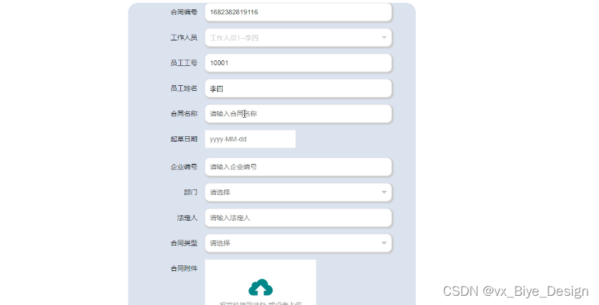 起草合同:工作人员可以新增填写合同信息,包括人员名称,工号,部门,法定人,合同类型,上传合同附件等信息。