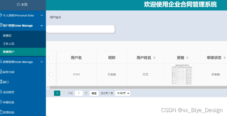 用户管理:管理和所有注册用户信息资料,添加工作人员信息,提交注册用户的审核状态。