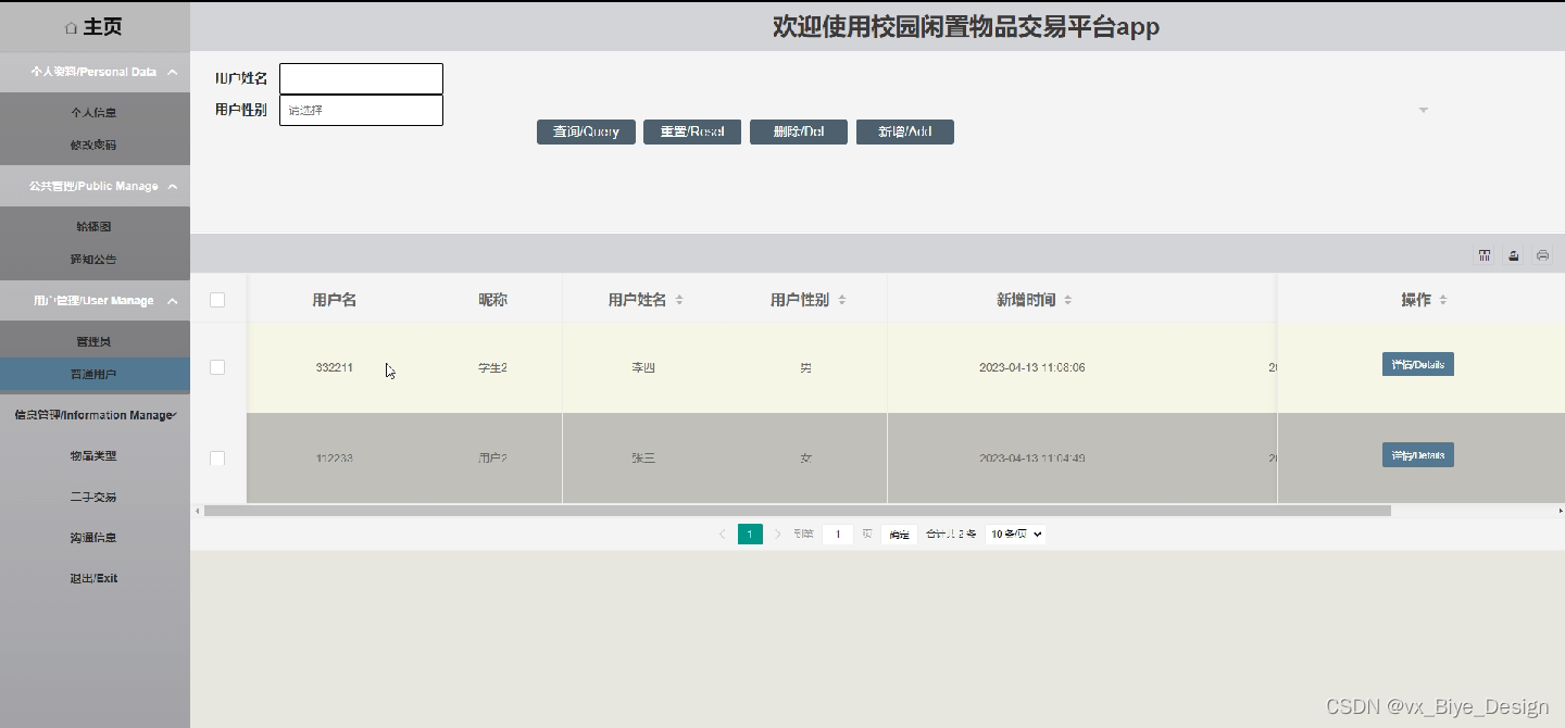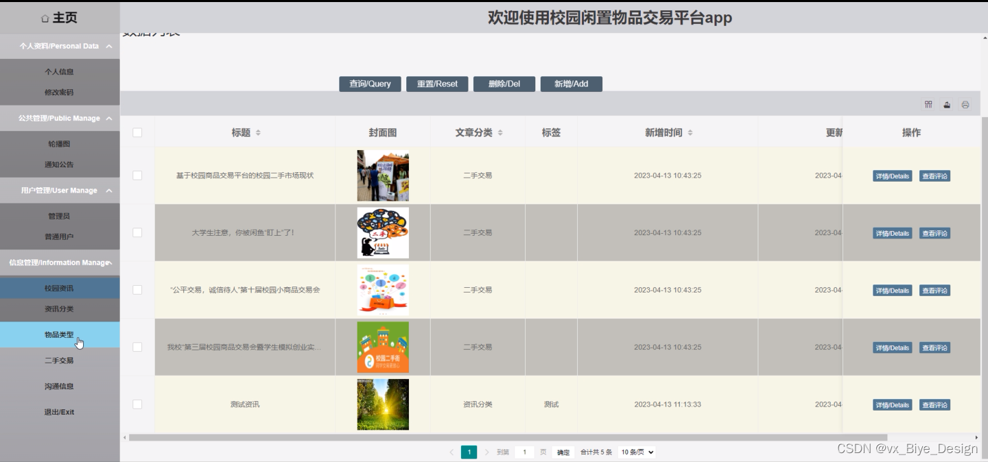 系统管理也都将通过计算机进行整体智能化操作,对于校园闲置物品交易平台app所牵扯的管理及数据保存都是非常多的,例如管理员;主页、个人资料(个人信息、修改密码)公共管理(轮播图、通知公告)用户管理(管理员、普通用户)信息管理(校园资讯、资讯分类)物品类型、二手交易、沟通信息,用户首页、网站公告、校园资讯、二手交易、沟通信息、基本信息等,这给管理者的工作带来了巨大的挑战,面对大量的信息,传统的管理系统,都是通过笔记的方式进行详细信息的统计,后来出现电脑,通过电脑输入软件将纸质的信息统计到电脑上,这种方式比较传统,而且想要统计数据信息比较麻烦,还受时间和空间的影响,所以为此开发了校园闲置物品交易平台app;为用户提供了方便管理平台,方便管理员查看及维护,并且可以通过需求进行内容的编辑及维护等;对于用户而言,可以随时进行查询所需信息,管理员可以足不出户就可以获取到系统的数据信息等,而且还能节省用户很多时间,所以开发校园闲置物品交易平台app给管理者带来了很大的方便,同时也方便管理员对用户信息进行管理。
