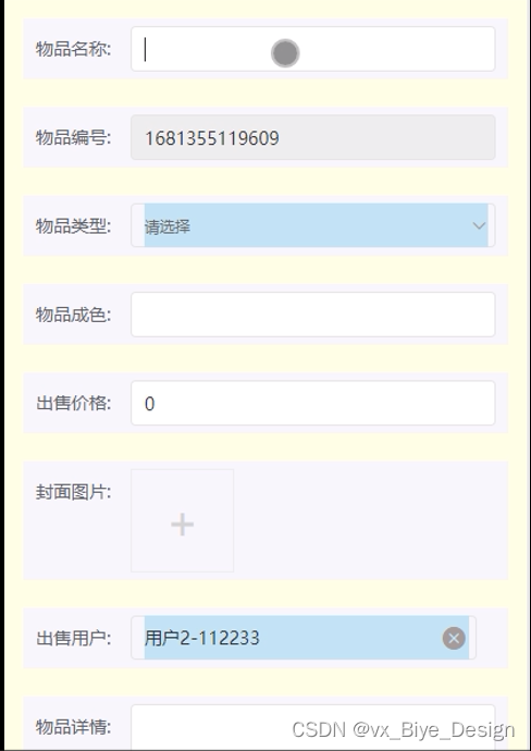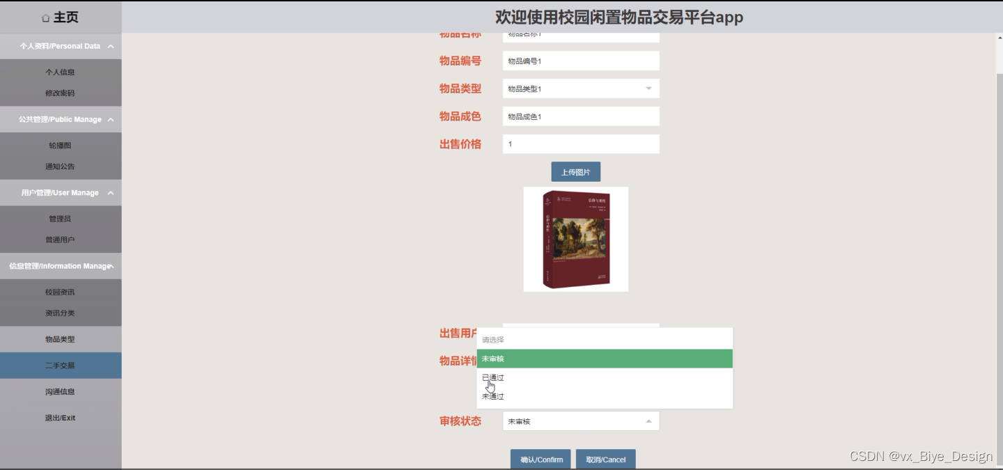 用户在此页面可查看二手商品详细信息,当看中需要的商品时可在线与发布者在线沟通,也可编辑物品名称、物品类型、物品成色、出售价格、封面图片、物品详情等信息进行发布闲置物品,由管理员进行审核通过后在前台展示,如图5.10所示。