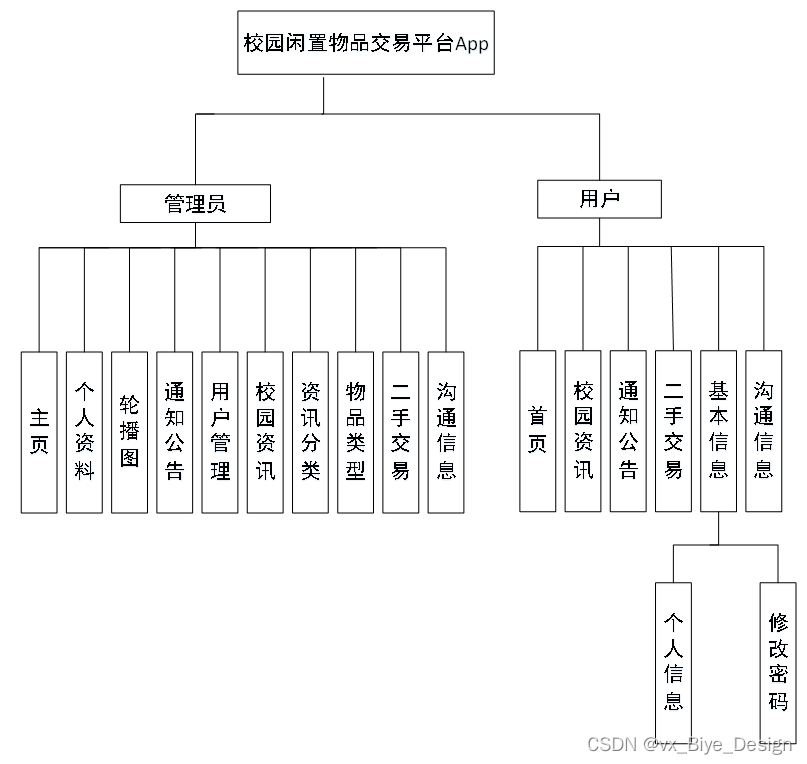 系统架构图属于系统设计阶段,系统架构图只是这个阶段一个产物,系统的总体架构决定了整个系统的模式,是系统的基础。基于校园闲置物品交易平台app的整体结构设计如图4-2所示。