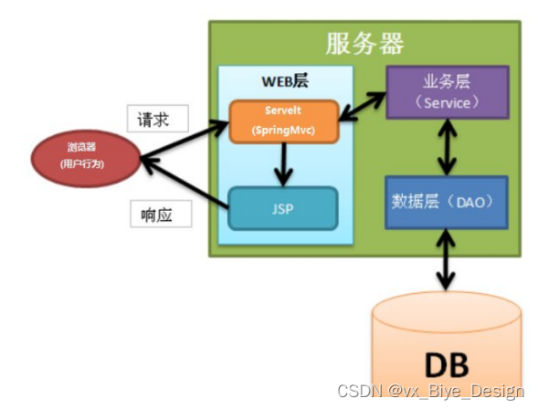 页面发送请求给控制器,控制器调用业务层处理逻辑,逻辑层向持久层发送请求,持久层与数据库交互,后将结果返回给业务层,业务层将处理逻辑发送给控制器,控制器再调用视图展现数据。