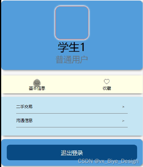 在我的页面用户可以进行添加、查看、编辑个人中心、收藏、二手交易、沟通信息等操作如图5.8所示。