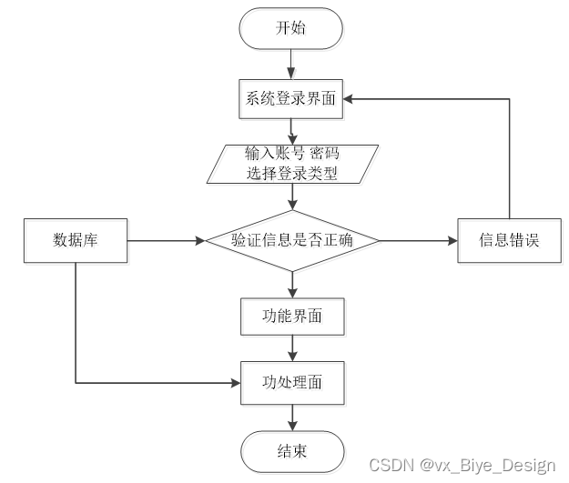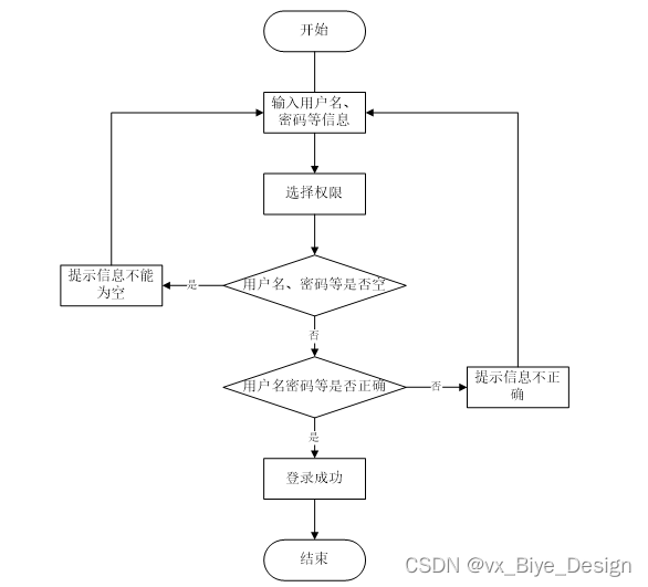 用户想进入系统,首先进入系统登录界面,通过正确的用户名、密码,选择登录类型登录,系统会检查登录信息,信息正确,然后输入相应的功能界面,提示信息错误,登录失败。系统操作流程如图3-4所示。