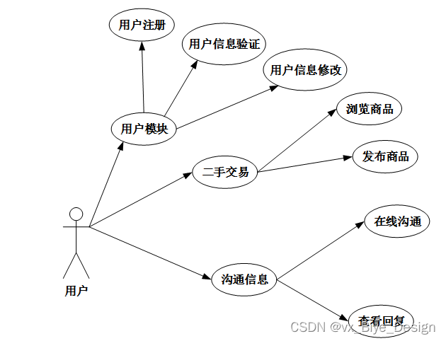 1.普通用户主要使用系统的校园闲置物品交易平台app操作首页、网站公告、二手交易、校园资讯、沟通信息、基本信息等,下图所示为普通用户的用例图。