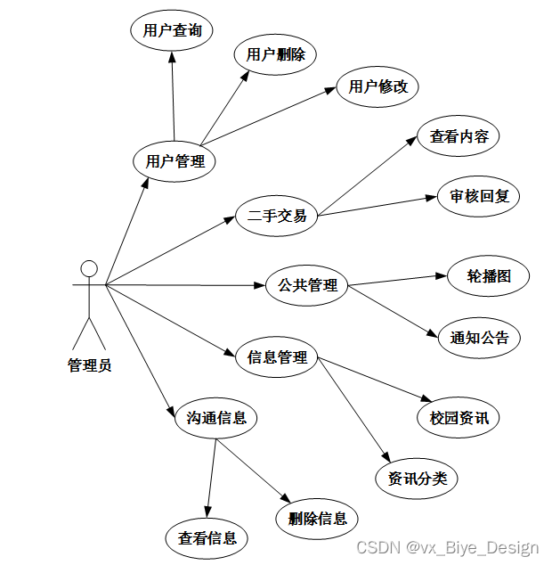 3.管理员主要负责主页、个人资料(个人信息、修改密码)公共管理(轮播图、通知公告)用户管理(管理员、普通用户)信息管理(校园资讯、资讯分类)物品类型、二手交易、沟通信息,下图所示描述管理员的用例图。