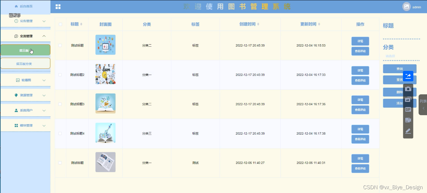 (4)交流管理:当点击“交流管理”这一菜单的时候,会出现留言板+留言板分类这两个子菜单,能够对用户在前台提交的留言板进行管理,同时对前台展示的留言板分类进行增删改查操作;