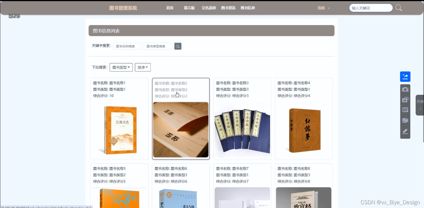 (5)图书信息:在首页导航栏上点击“图书信息”弹跳出的是图书信息列表,可以点击随意一款图书信息进行了解其具体信息。包括图书名称、图书类型、综合评分等;