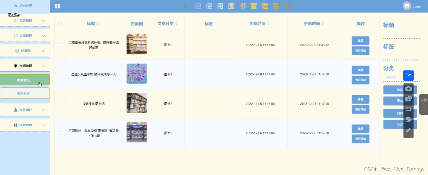 (6)资源管理:当点击“资源管理”这一菜单的时候,会出现图书资讯+资讯分类两个子菜单,可以对这两个模块进行增删改查操作;