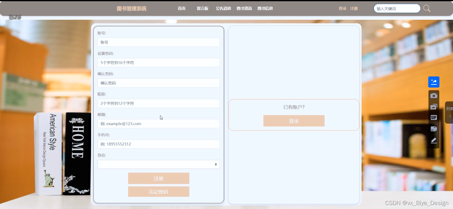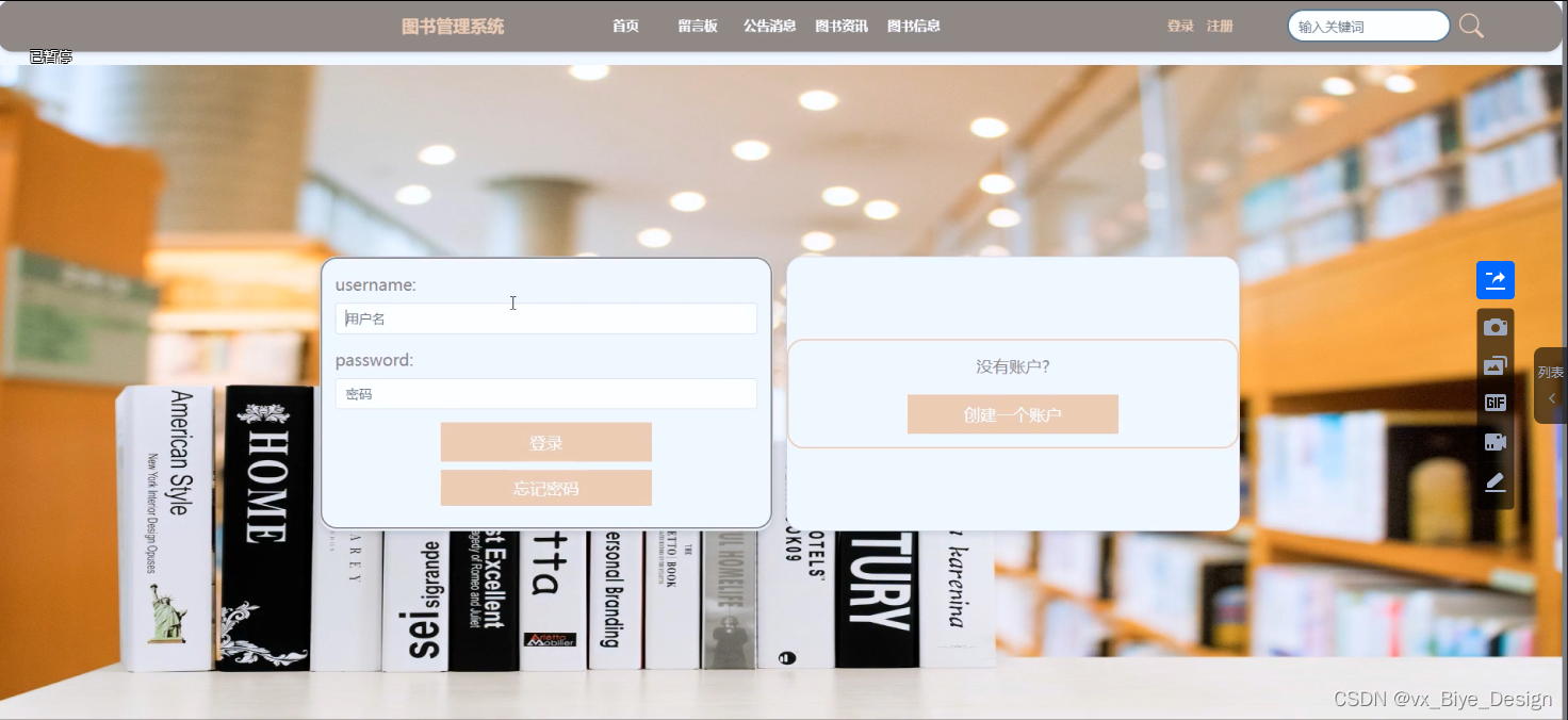 (1)用户注册登录:游客可以随时进入到系统中,对系统中的信息浏览,但是想要实现图书信息以及留言板等操作,就必须有这个系统的账号,如果没有账号的话,可以注册以后进行相关的操作,同时用户还可以通过“个人账户”这以按钮对个人信息以及操作的信息进行管控。