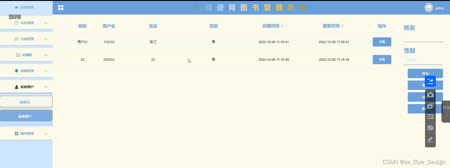 (3)系统用户管理:当点击“系统用户管理”这一菜单的时候,会出现管理员+系统用户两个子菜单,可以对这两个模块进行增删改查操作;