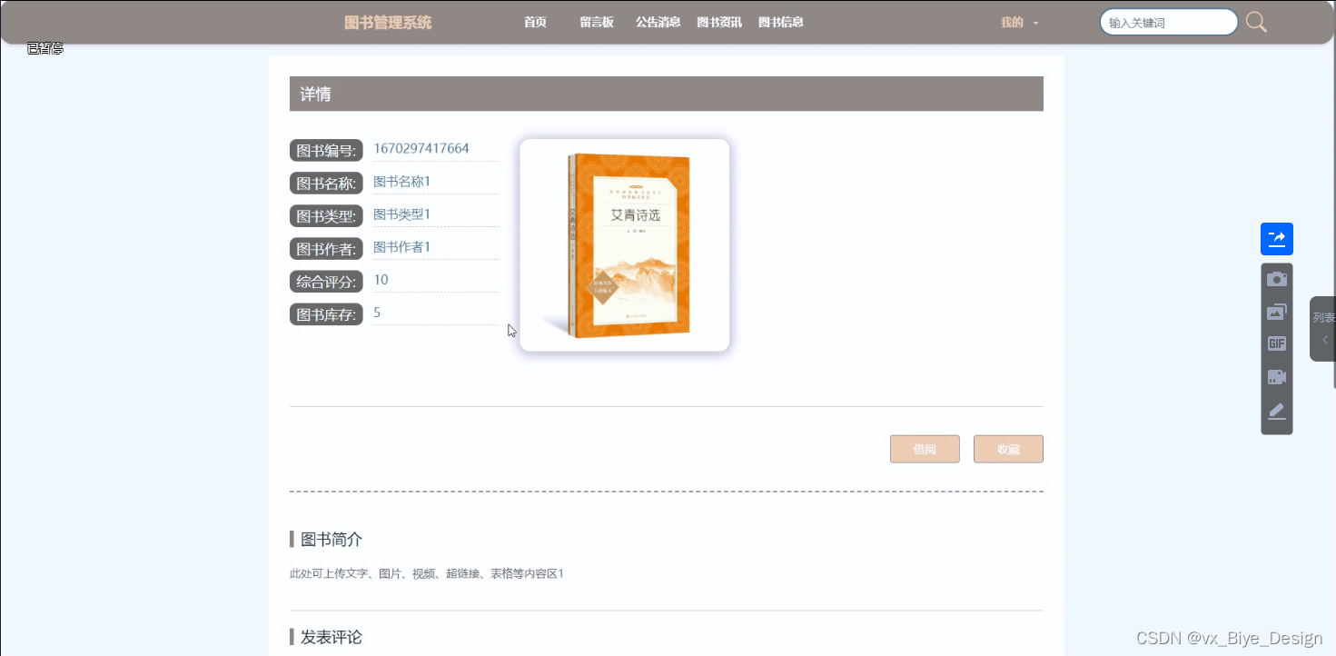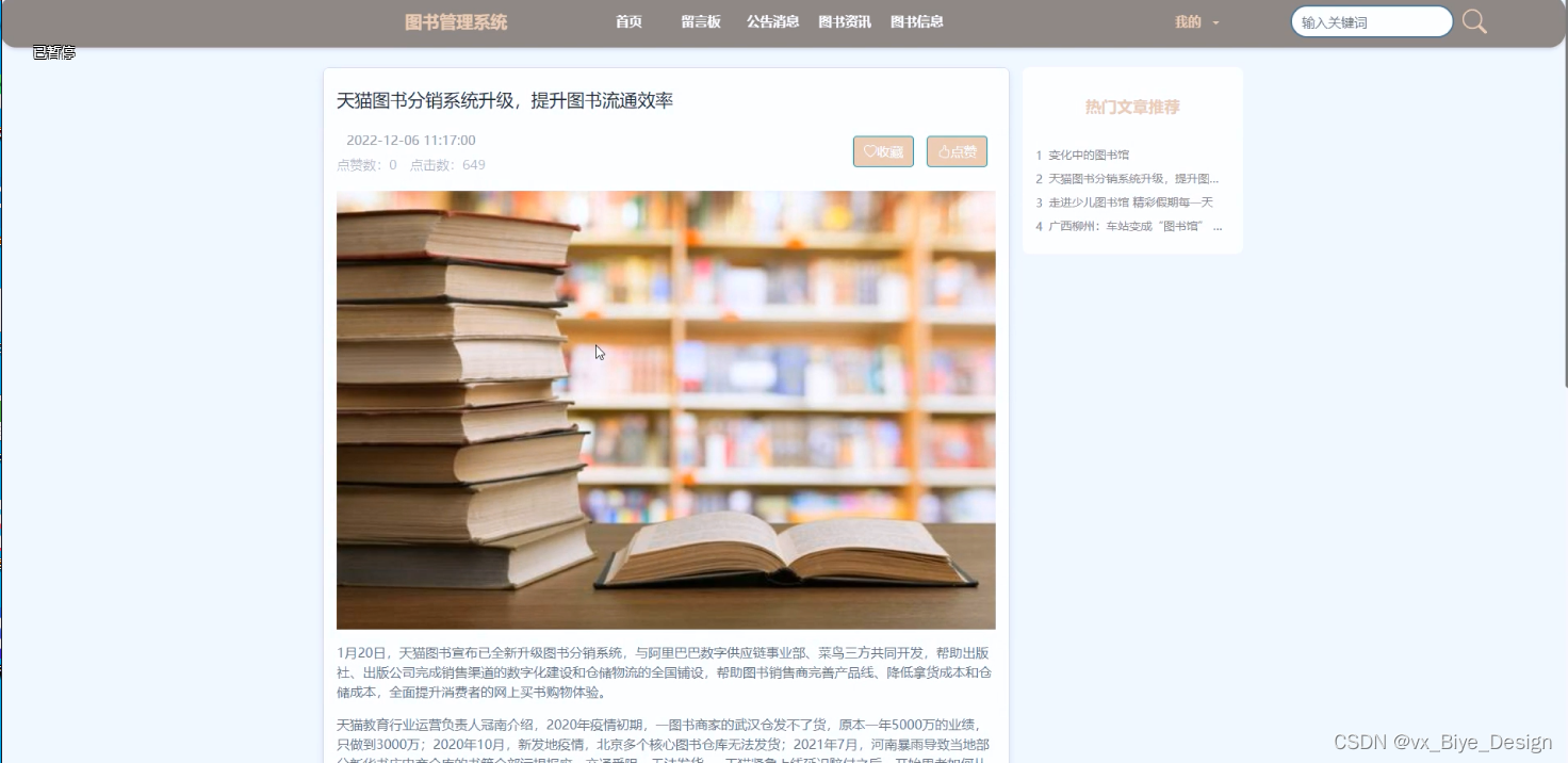 (3)图书资讯:用户可以查看图书资讯信息,在查询到自己想要了解的图书资讯的时候,可以进入查看详细的介绍进行评论、点赞、收藏操作。