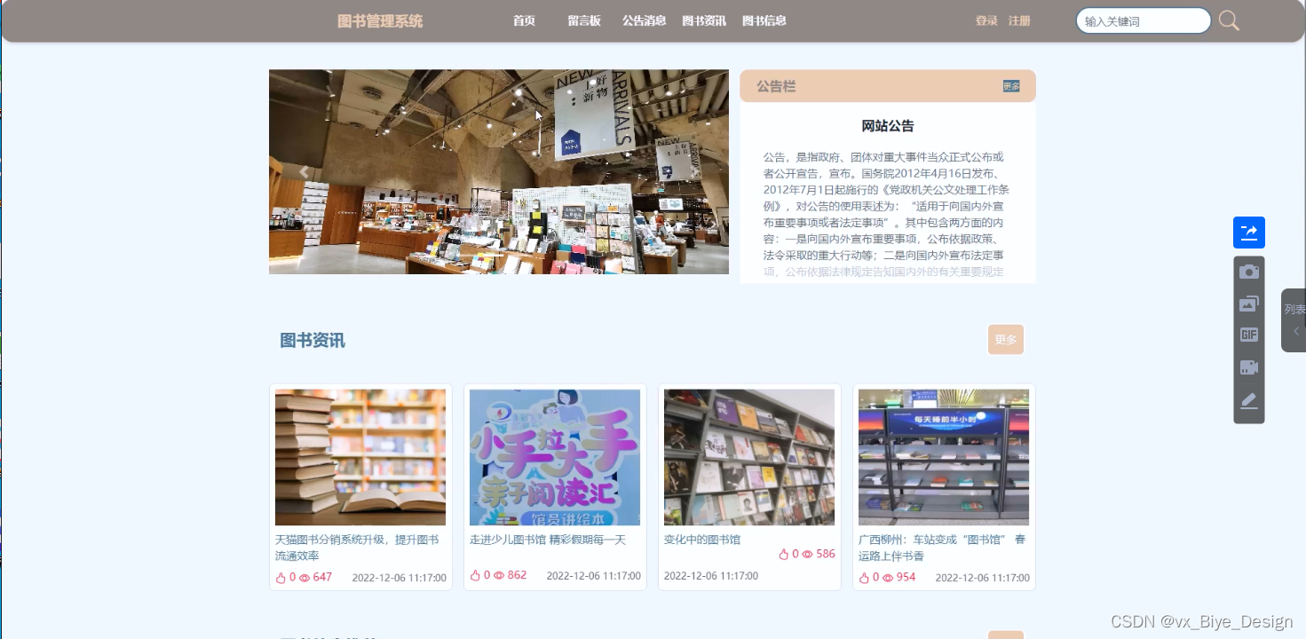 系统开发是采用java语言,基于MVVM模式进行开发,采取MySQL作为后台数据的主要存储单元,采用springboot框架实现了本系统的全部功能。图书管理系统解决了传统管理方式所带来的人力、物力和时间上的虚耗和交流深度的限定,这让交流的过程更快捷、准确、便利,同时完成图书管理系统的基本功能:公告管理、资源管理、系统用户、图书信息、类型管理、借阅记录、归还记录。