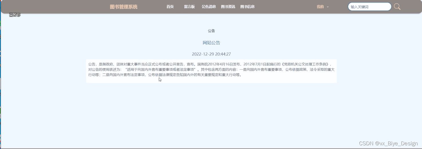 (2)公告消息:在首页导航栏上我们会看到“公告消息”这一菜单,我们点击进入进去以后,会看到所有管理员在后台发布的公告信息;