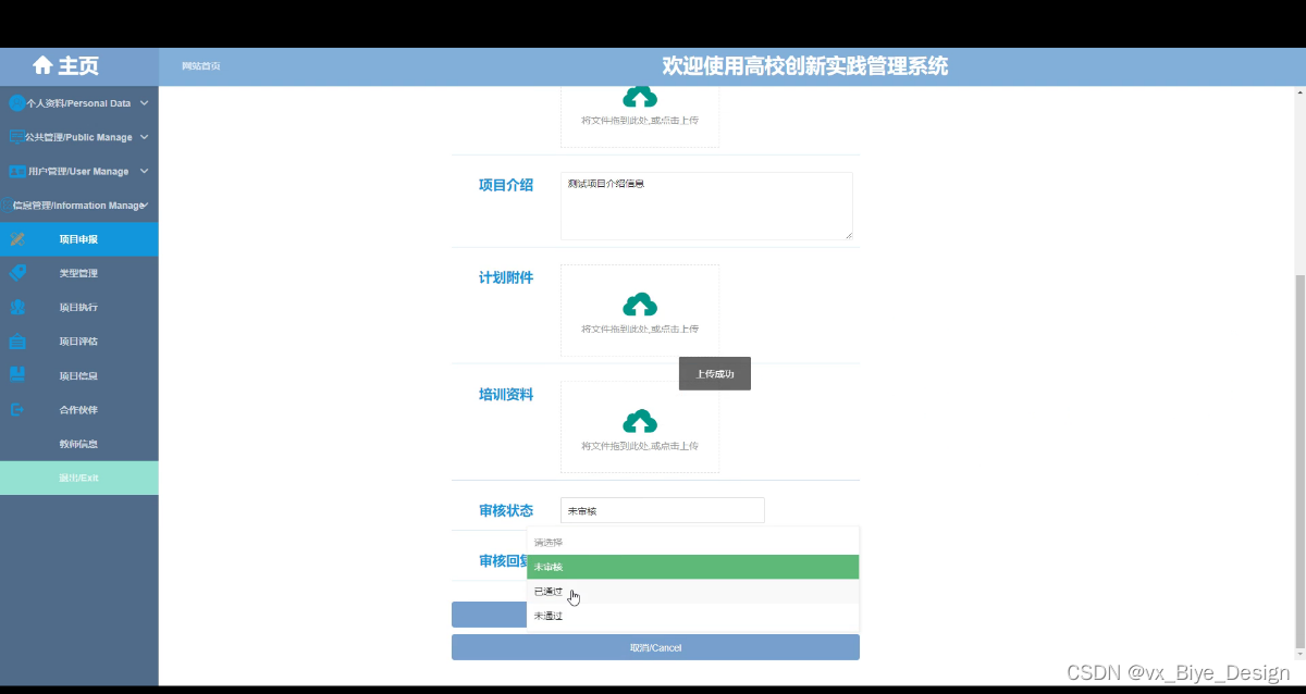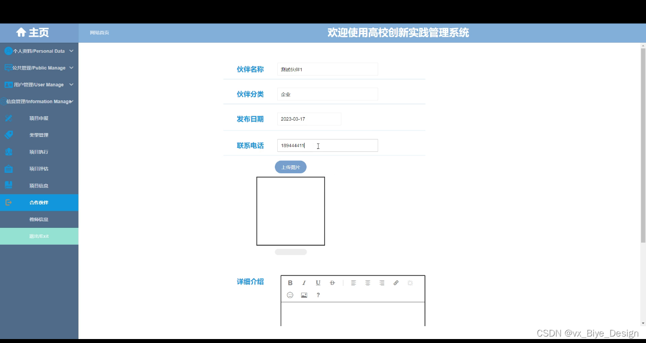 3、功能的完善性:主页,个人资料,公共管理(轮播图,公告信息),用户管理(管理员,学生用户),信息管理(交流论坛,论坛分类,新闻资讯,新闻分类),项目申报,类型管理,项目执行,项目评估,项目信息,合作伙伴,教师信息等模块的修改维护操作。
