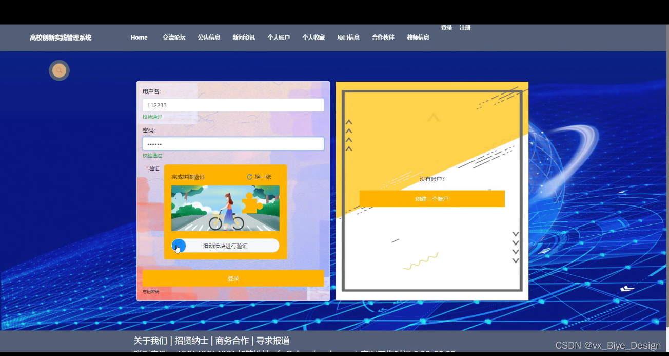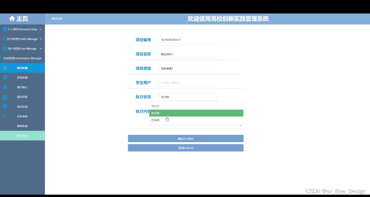 学生用户登录高校创新实践管理系统,功能为:首页,交流论坛,公告信息,新闻资讯,个人账户,个人收藏,项目申报,项目信息,合作伙伴,教师信息,后台主页,个人资料,项目申报,项目执行,项目评估,项目信息等功能,如下图所示: