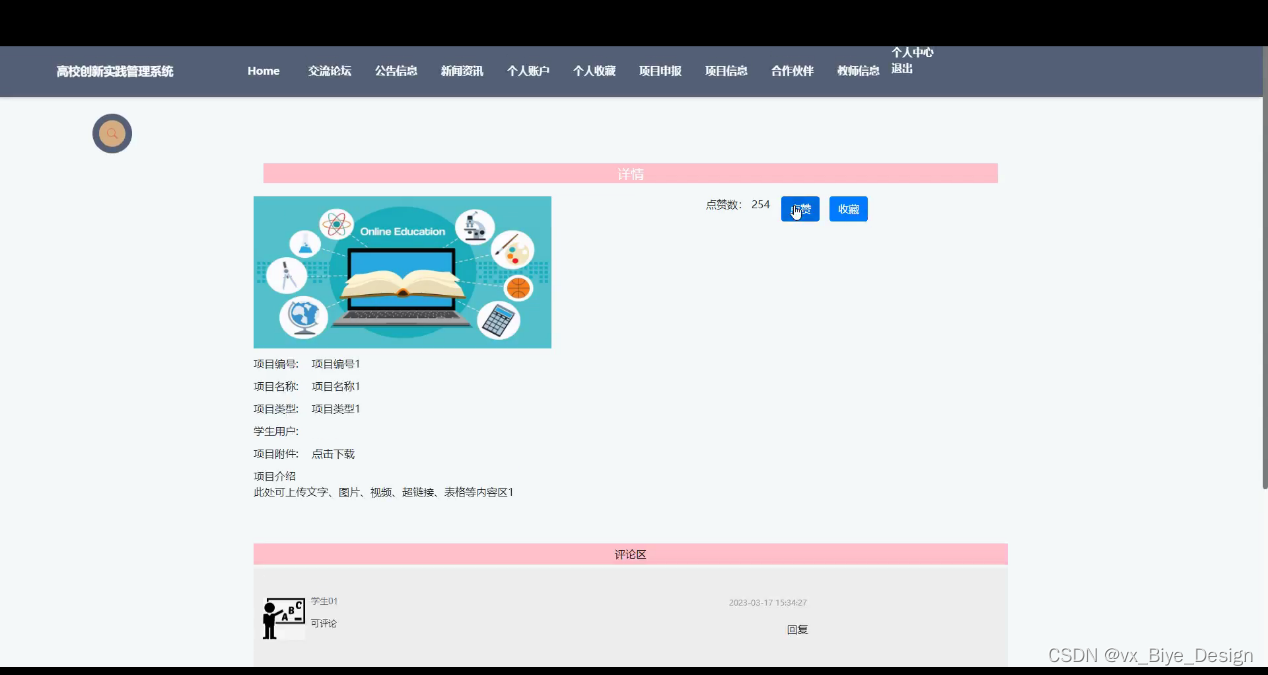 项目信息, 在此界面图可查看其他用户发布的项目信息,还可在此页面对进行点赞,评论,收藏等操作,如下图所示。