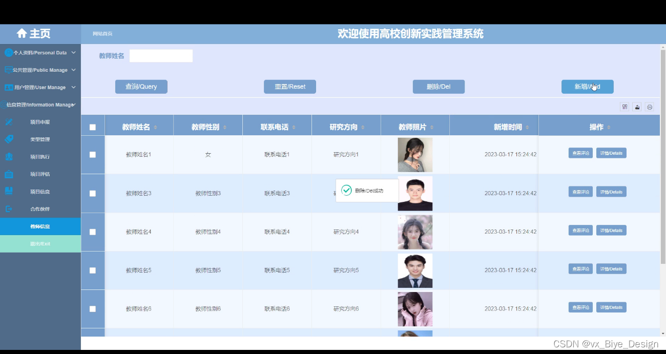 教师信息, 在此界面图可查看教师的详细信息,包含教师姓名,性别,研究方向,联系方式等信息,还可在此页面对进行重置,删除,新增等操作,如下图所示。