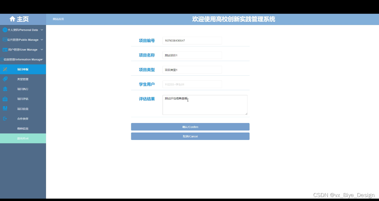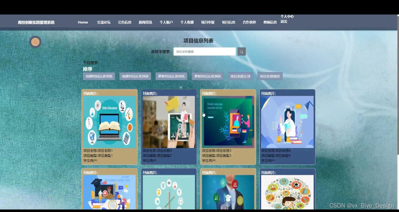 (1)功能要求:主页,个人资料,公共管理(轮播图,公告信息),用户管理(管理员,学生用户),信息管理(交流论坛,论坛分类,新闻资讯,新闻分类),项目申报,类型管理,项目执行,项目评估,项目信息,合作伙伴,教师信息等功能模块。