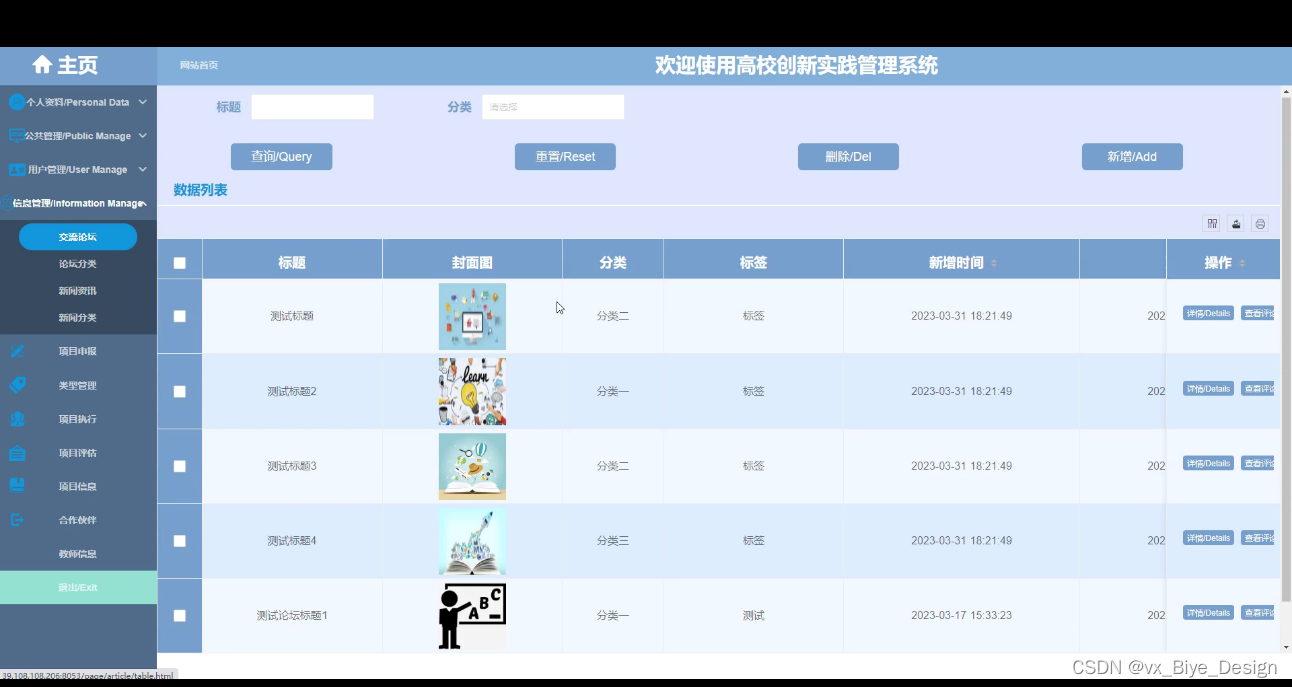 交流论坛管理,在此界面图可查看论坛标题,封面图,分类,标签等信息,还可在此页面对进行重置,删除,新增等操作,如图5-5所示: