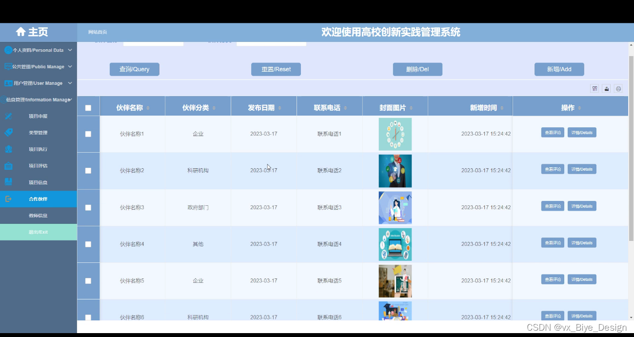 合作伙伴, 在此界面图可查看合作伙伴的详细信息,包含伙伴名称,类型,发布日期,联系方式等信息,还可在此页面对进行重置,删除,新增等操作,如下图所示。