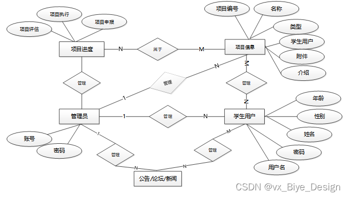 通过高校创新实践管理系统的功能进行规划分成几个实体信息,实体信息将通过ER图进行说明,本系统的主要实体图如下: