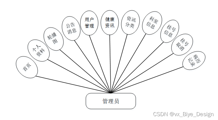 管理员登录后可进行首页、个人资料(个人信息、修改密码)、公共管理(轮播图、公告消息)、用户管理(管理员、普通用户、医生用户)、信息管理(健康资讯、资讯分类)、科室信息、挂号信息、挂号取消、病历记录等,管理员用户的用例如图3-1所示。