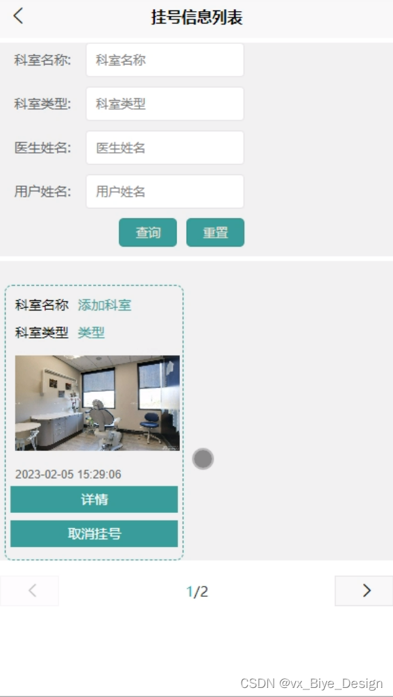 挂号信息列表:通过挂号信息列表页面,可以获取科室名称、科室类型、医生姓名、用户姓名、科室位置、科室图片、挂号用户、预约时间、审核状态、审核回复等信息,进行预约操作,如图5-4所示。