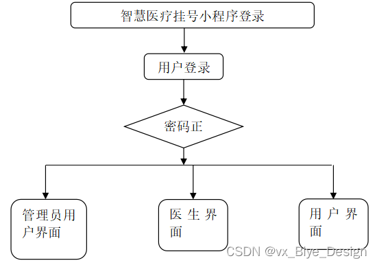 使用智慧医疗挂号小程序系统的用户分管理员、医生和用户三个角色的权限子模块。