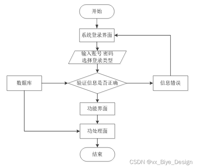 用户想进入系统,首先进入系统登录界面,通过正确的用户名、密码,选择登录类型登录,系统会检查登录信息,信息正确,然后输入相应的功能界面,提示信息错误,登录失败。系统操作流程如图3-5所示。