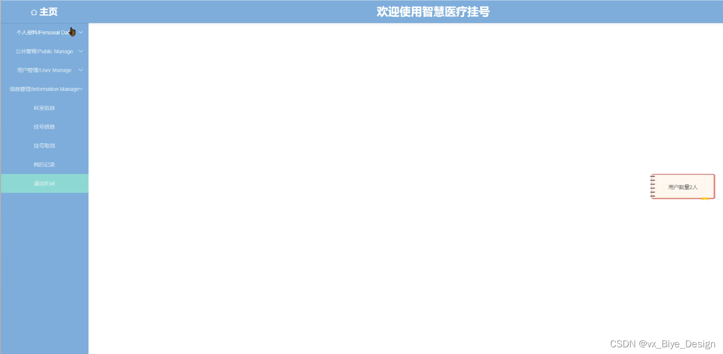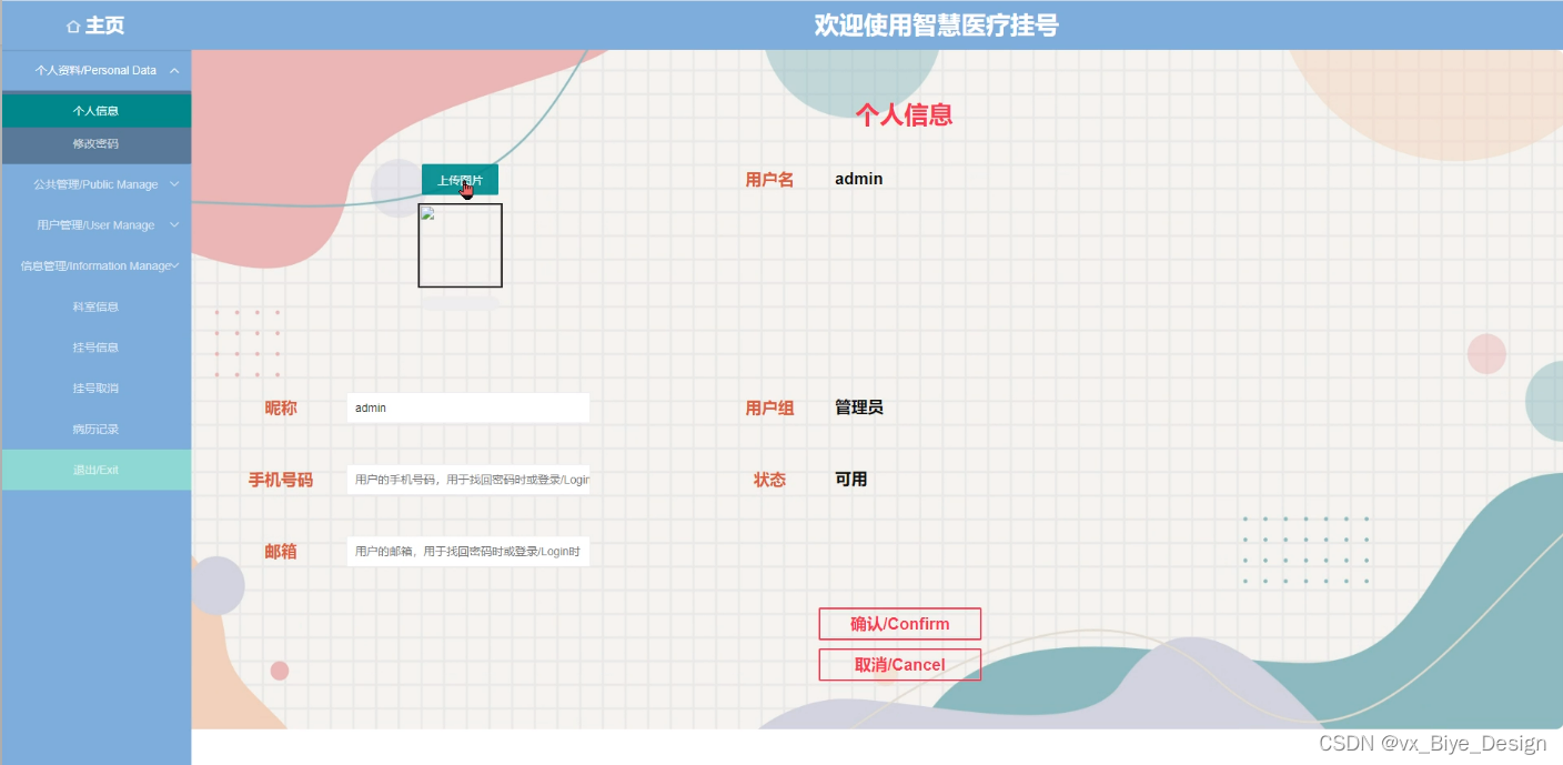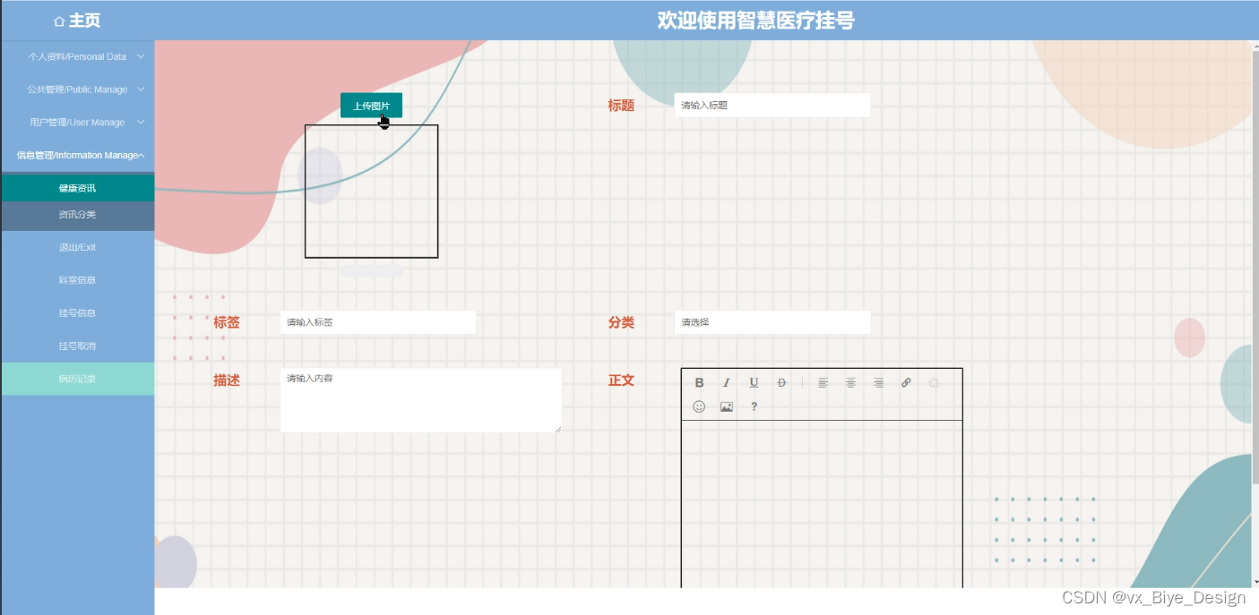 模块包括首页、个人资料(个人信息、修改密码)、公共管理(轮播图、公告消息)、用户管理(管理员、普通用句号、医生用户)、信息管理(健康资讯、资讯分类)、科室信息、挂号信息、挂号取消、病历记录等进行相应的操作。