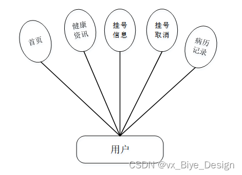 用户注册登录后可进行首页、健康资讯、我的(挂号信息、挂号取消、病历记录)管理,用户用例如图3-3所示。