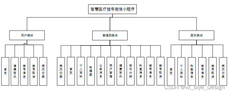 这些功能可以充分满足智慧医疗挂号小程序的需求。此系统功能较为全面如下图系统功能结构如图4-3所示。
