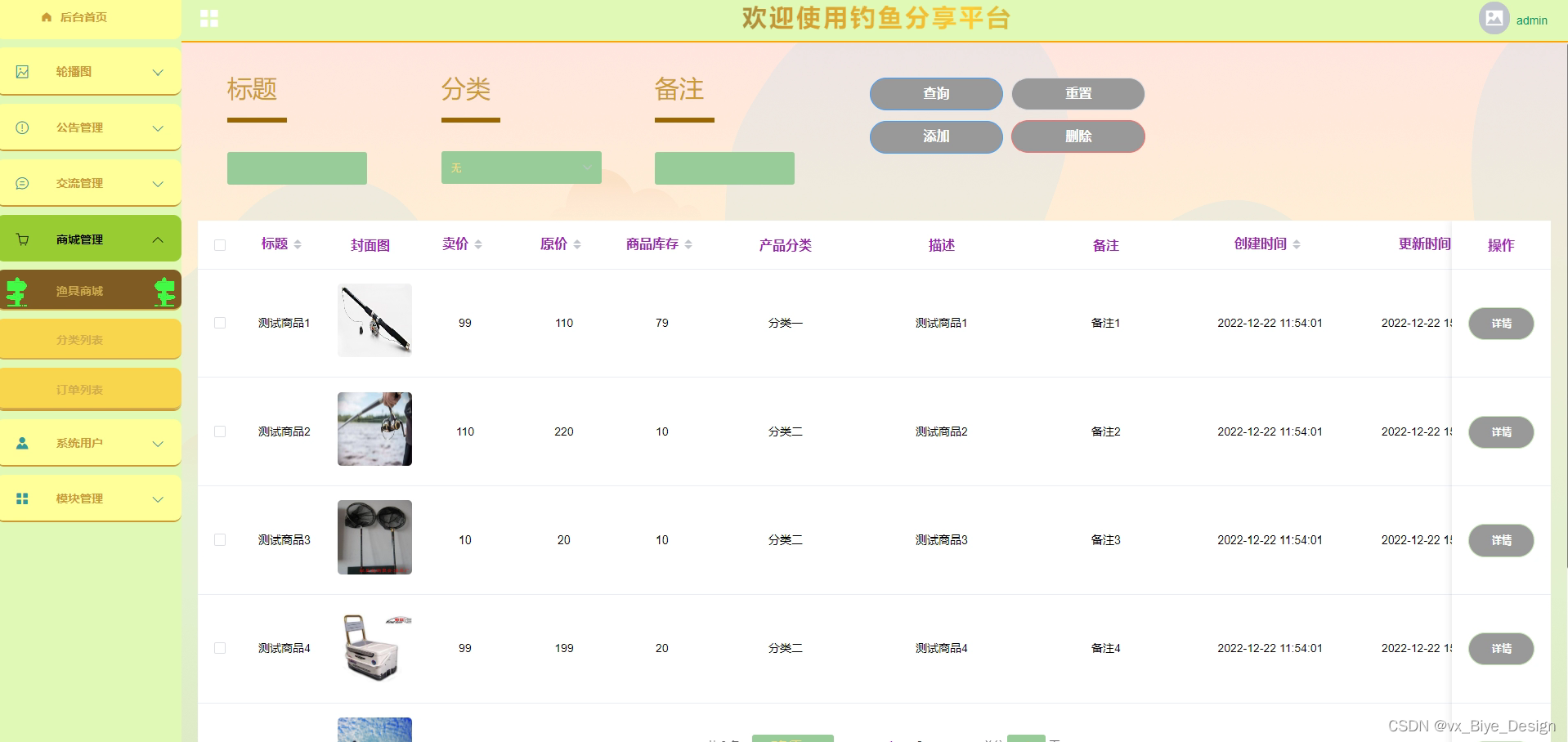 商城管理,在渔具商城信息列表页面可以进行渔具产品的修改或删除操作,如图5-9所示。