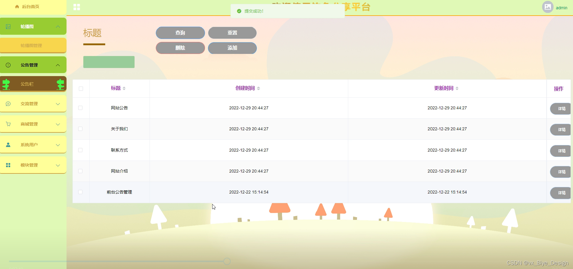 在管理员功能页面可以查看用户管理(管理员、用户注册)公告管理(平台公告发布)交流管理(渔获论坛、论坛分类)商城管理(渔具商城、分类列表、订单列表)模块管理(钓鱼地点、钓鱼达人、渔获排名、组队中心、入队申请)等内容进行相对应操作,如图5-7所示。