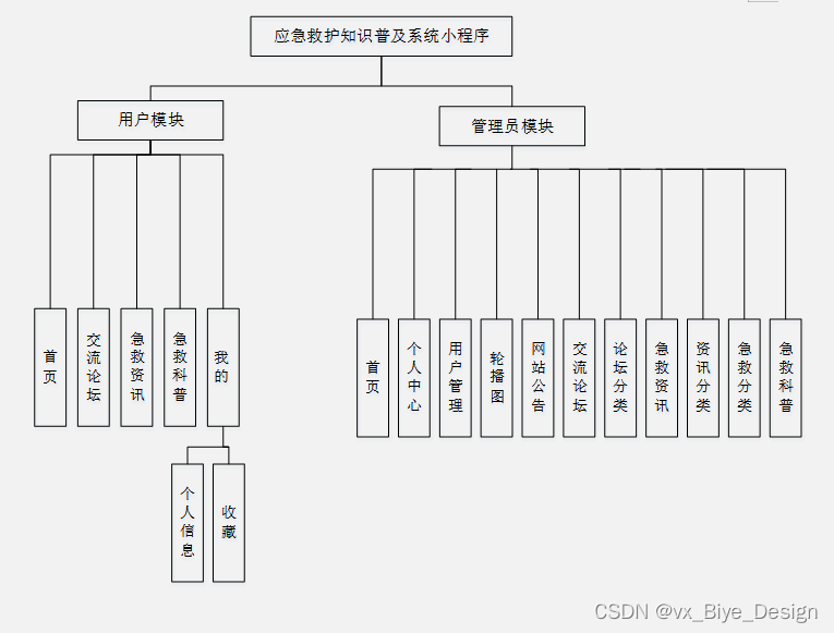基于应急救护知识普及系统小程序基于现有的手机,可以实现管理员,首页、个人资料、公共管理(轮播图、网站公告)信息管理(交流论坛、论坛分类、急救资讯、资讯分类)急救分类、急救科普等详细的了解及统计分析。根据系统功能需求建立的模块关系图如下图: