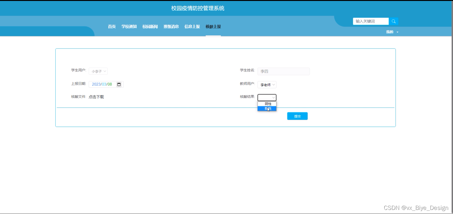 (10)核酸上报:当点击“核酸上报”这一菜单的时候,可通过搜索上报日期、核酸结果进行查看学生用户、学生姓名、教师用户、核酸结果、核酸文件、上报日期等详细信息,并可根据需要进行审核、增删改查等相应操作;