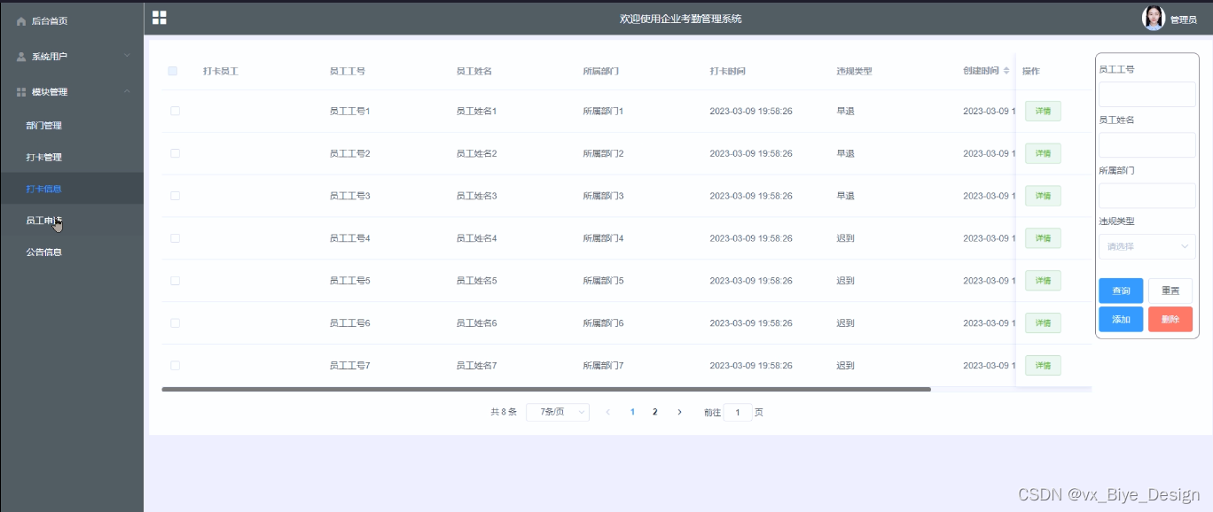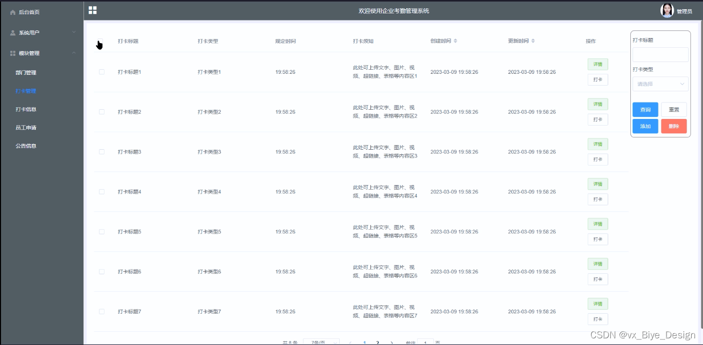 (3)打卡管理:点击“打卡管理”这一按钮可以查看到系统当中所有的打卡,支持通过打卡标题或者打卡类型进行查询打卡管理,如果想要添加新的打卡管理,点击“添加”按钮,然后根据提示填写好打卡的具体信息,点击提交所添加的打卡管理在数据库就保存下来了,同时可以点击“打卡”按钮,输入打卡的员工信息进行提交,也可以选择要删除的打卡直接点击“删除按钮”进行打卡删除。